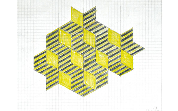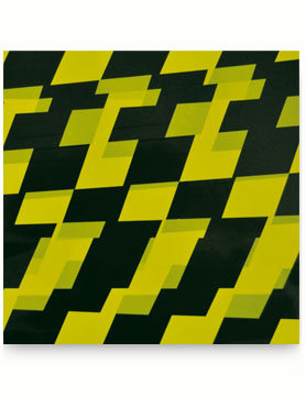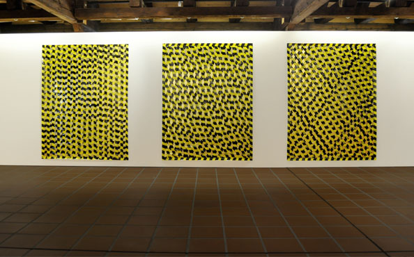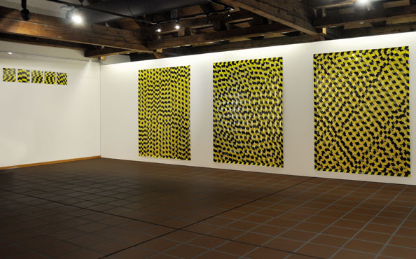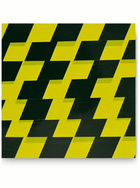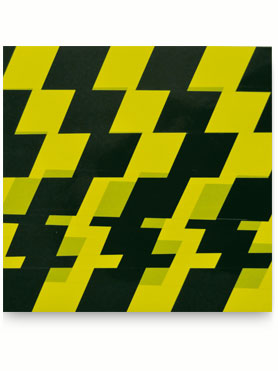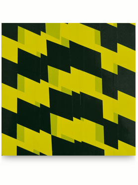 Ein schwarz-gelbes Klebeband wird bei der Werkgruppe „care” in unterschiedlichen Rastern auf eine durchsichtige Folie geklebt. Dadurch entstehen immer wieder neue optische Eindrücke. Bei „city” wird mit der Transparenz des Materials gespielt.